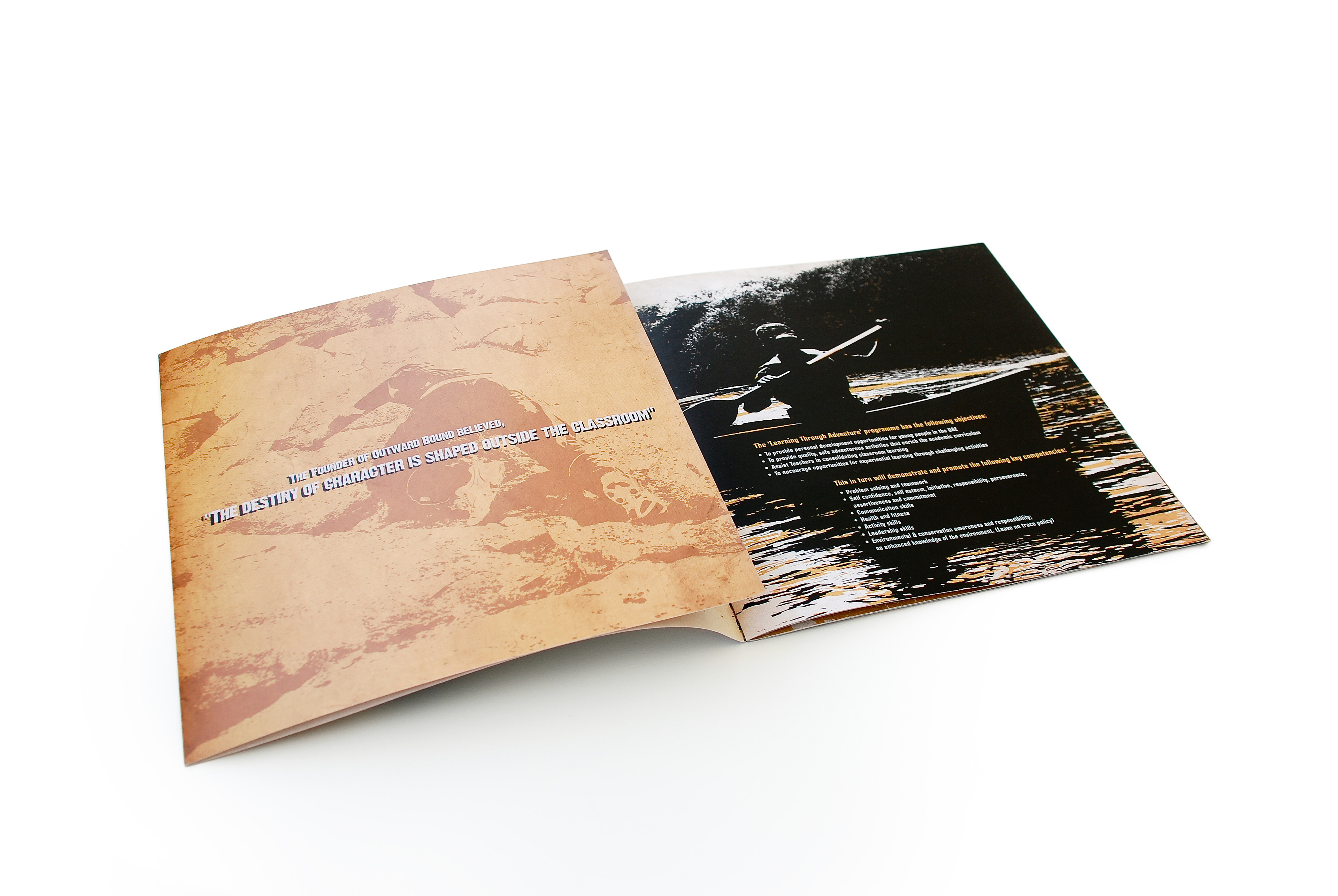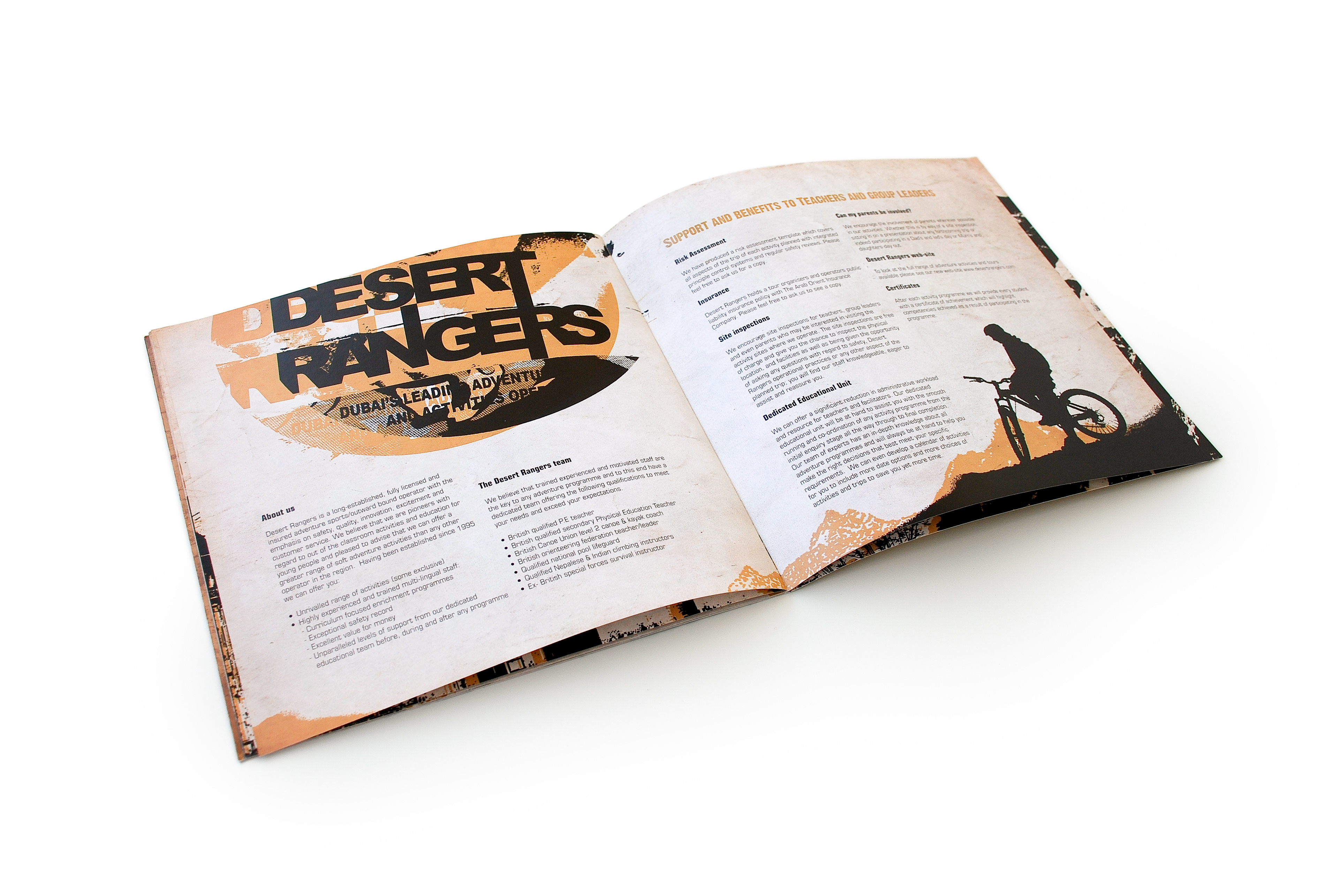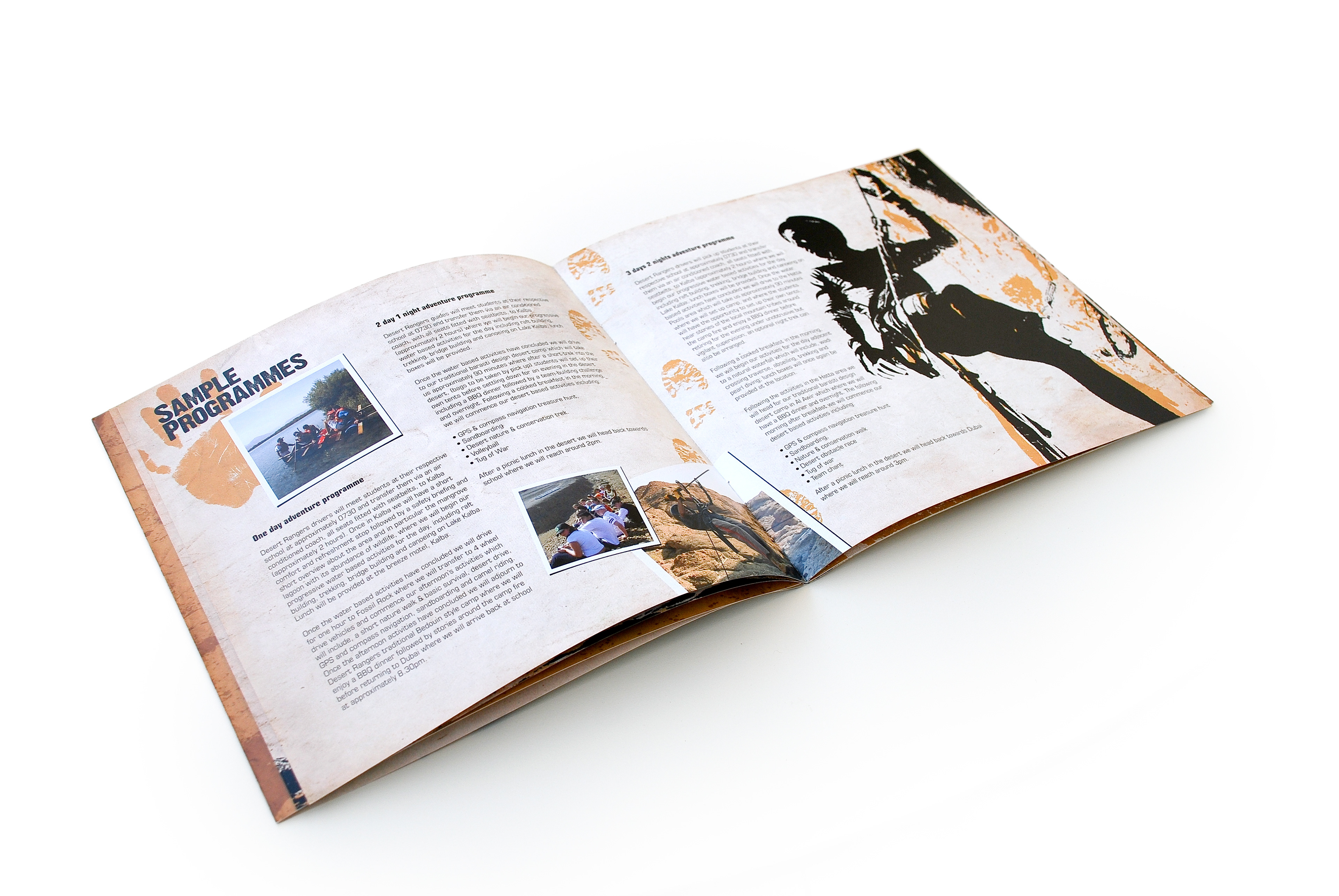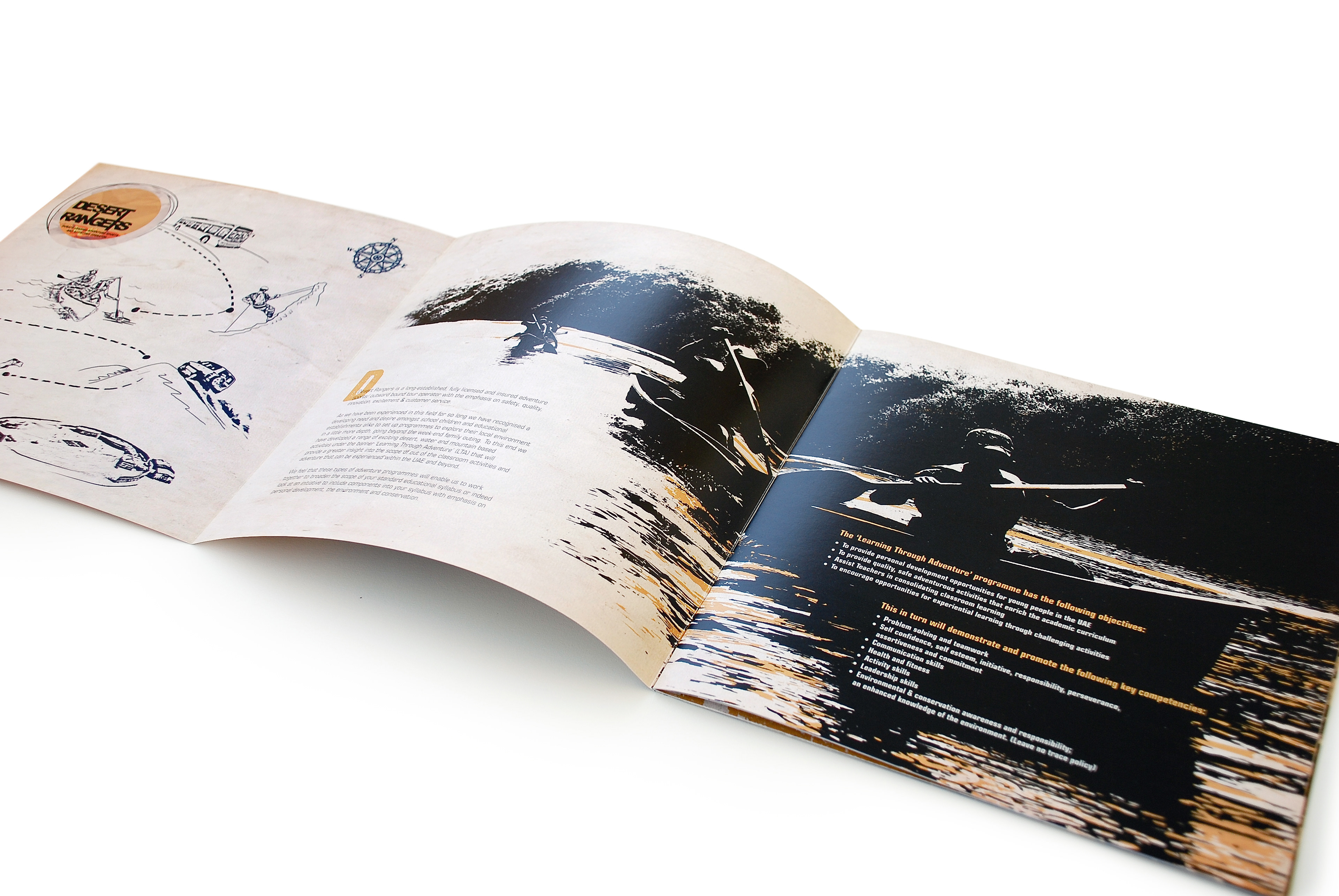 This brochure was designed for Desert Rangers, a licensed adventure education company specializing in experiential learning through outdoor activities. The concept merges rugged exploration visuals with educational storytelling, reflecting the program’s focus on teamwork, leadership, and environmental responsibility. The layout balances hand-drawn route illustrations with dramatic photography to capture the spirit of discovery and the organization’s mission to teach “through adventure.”