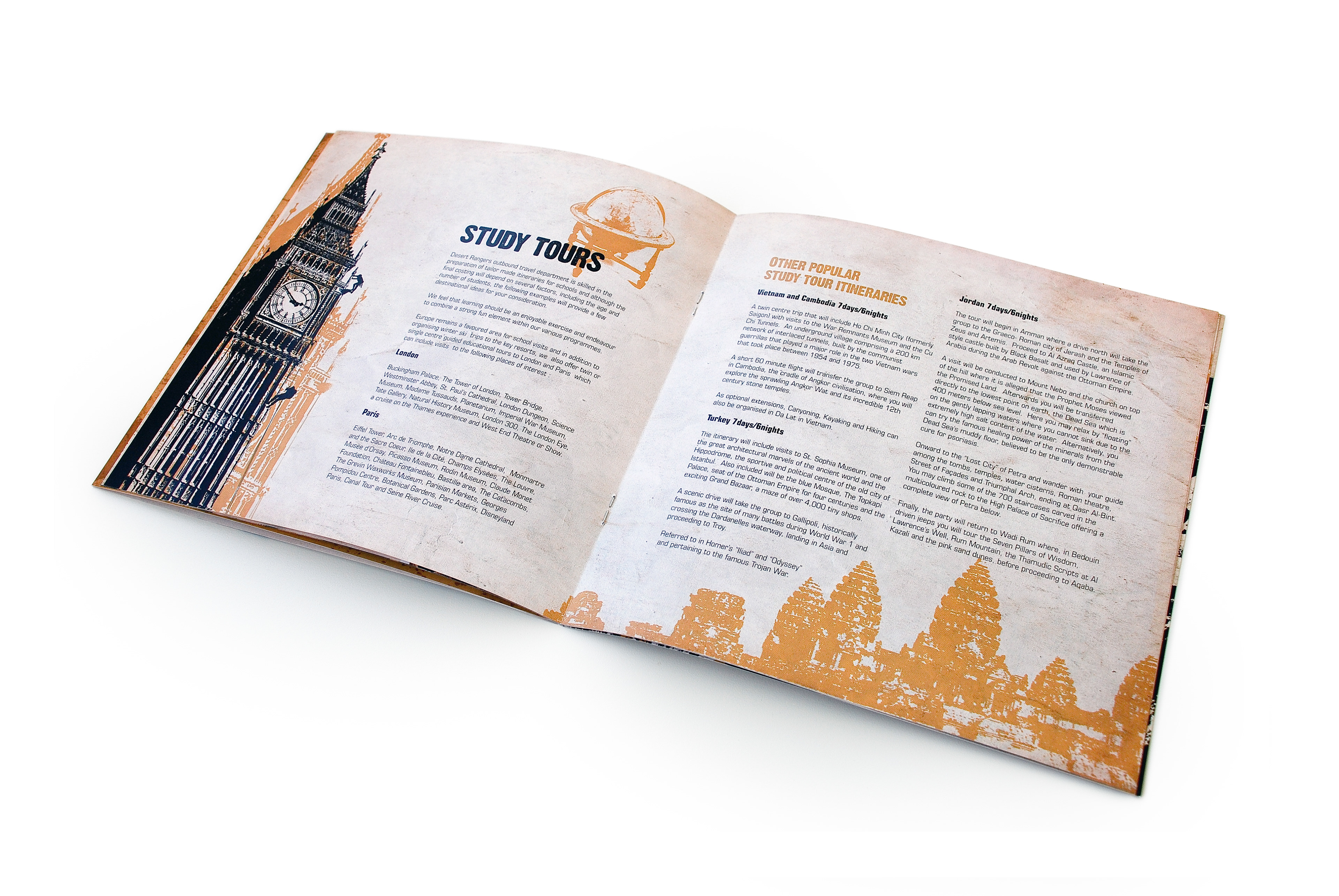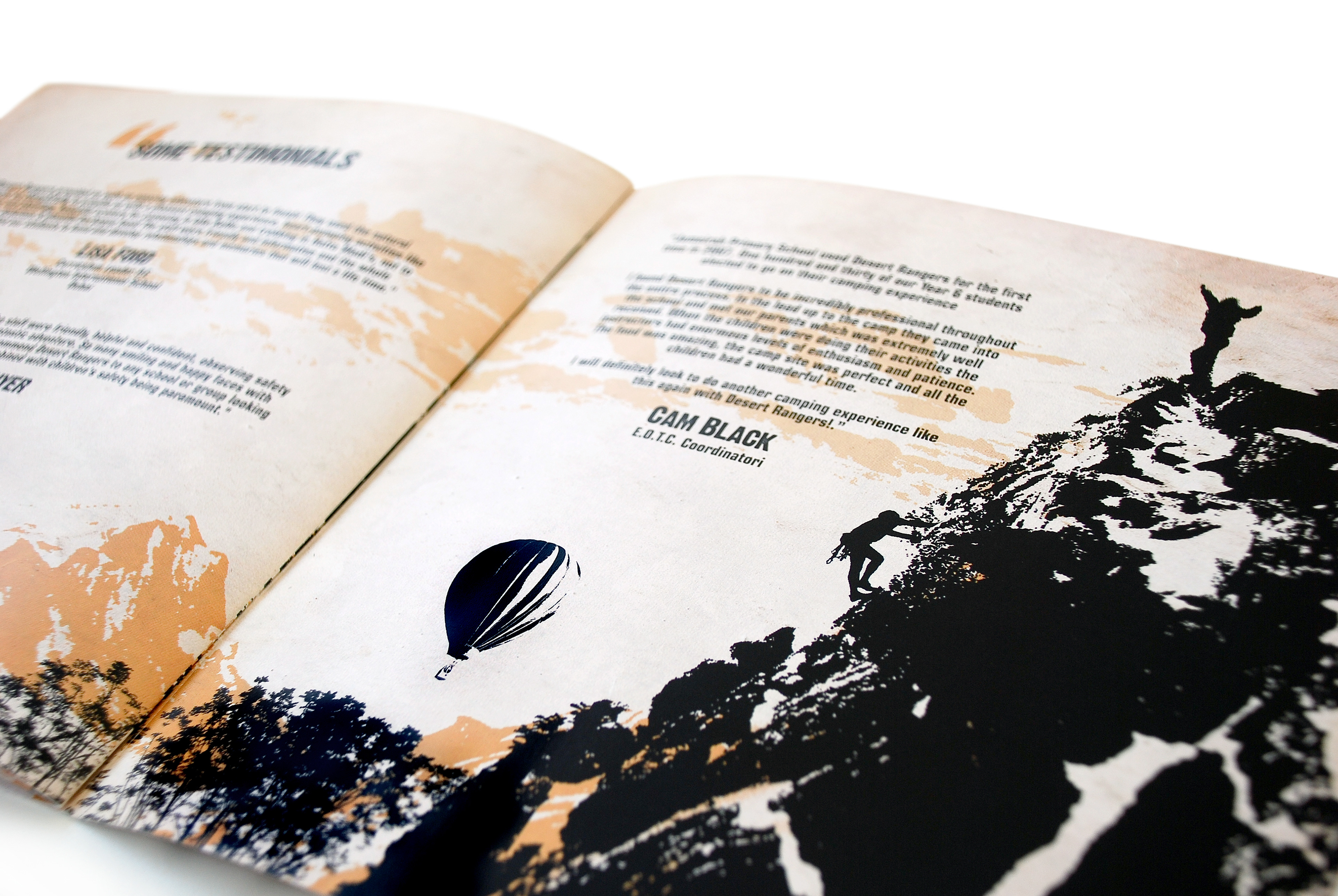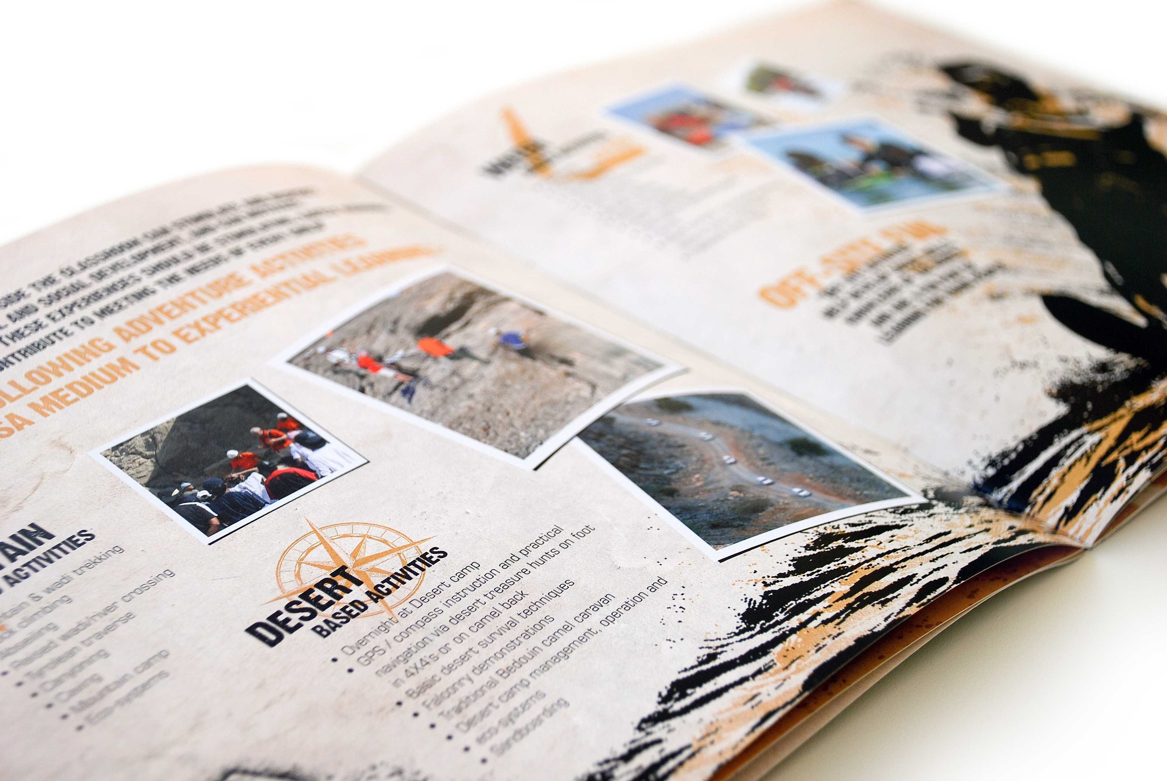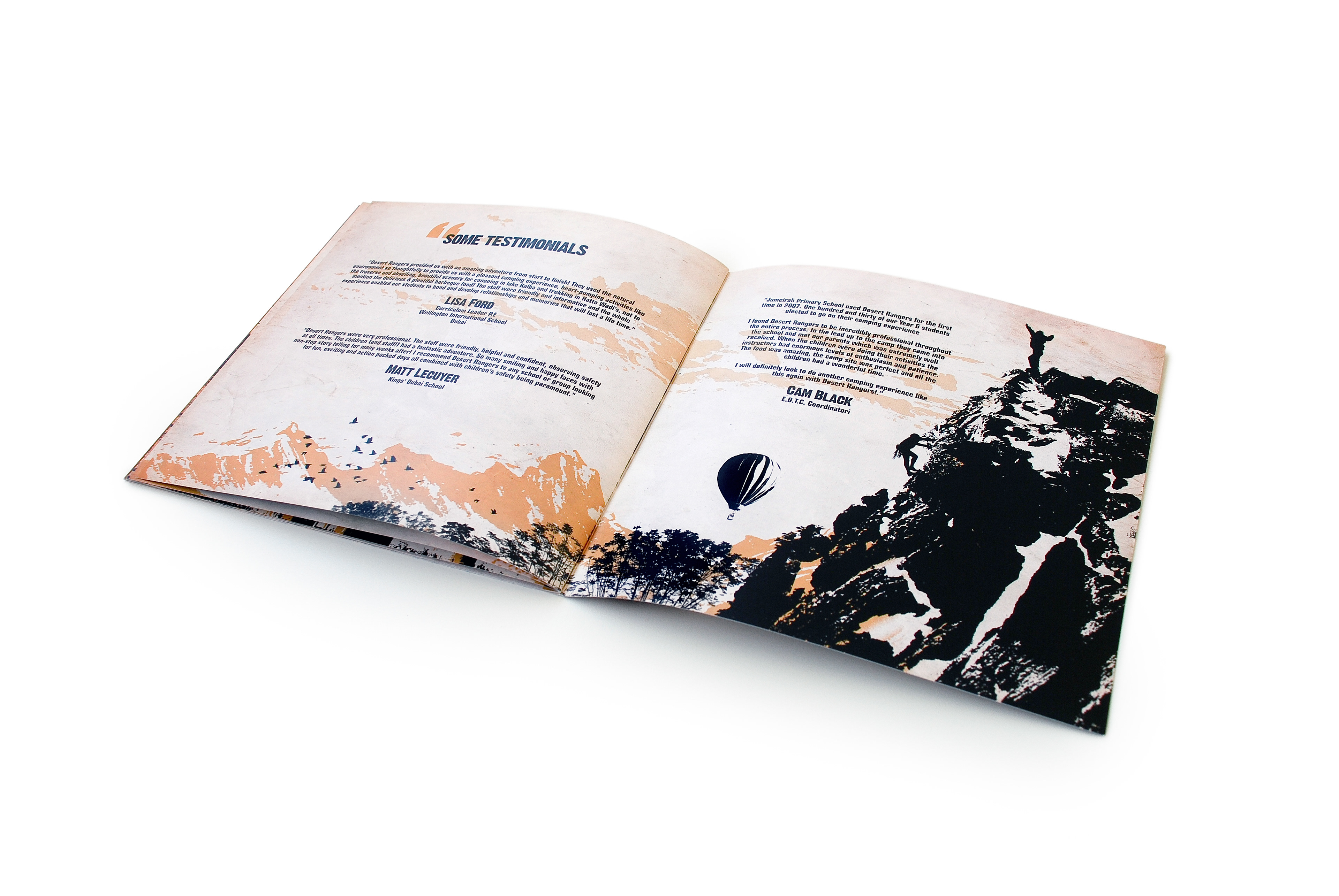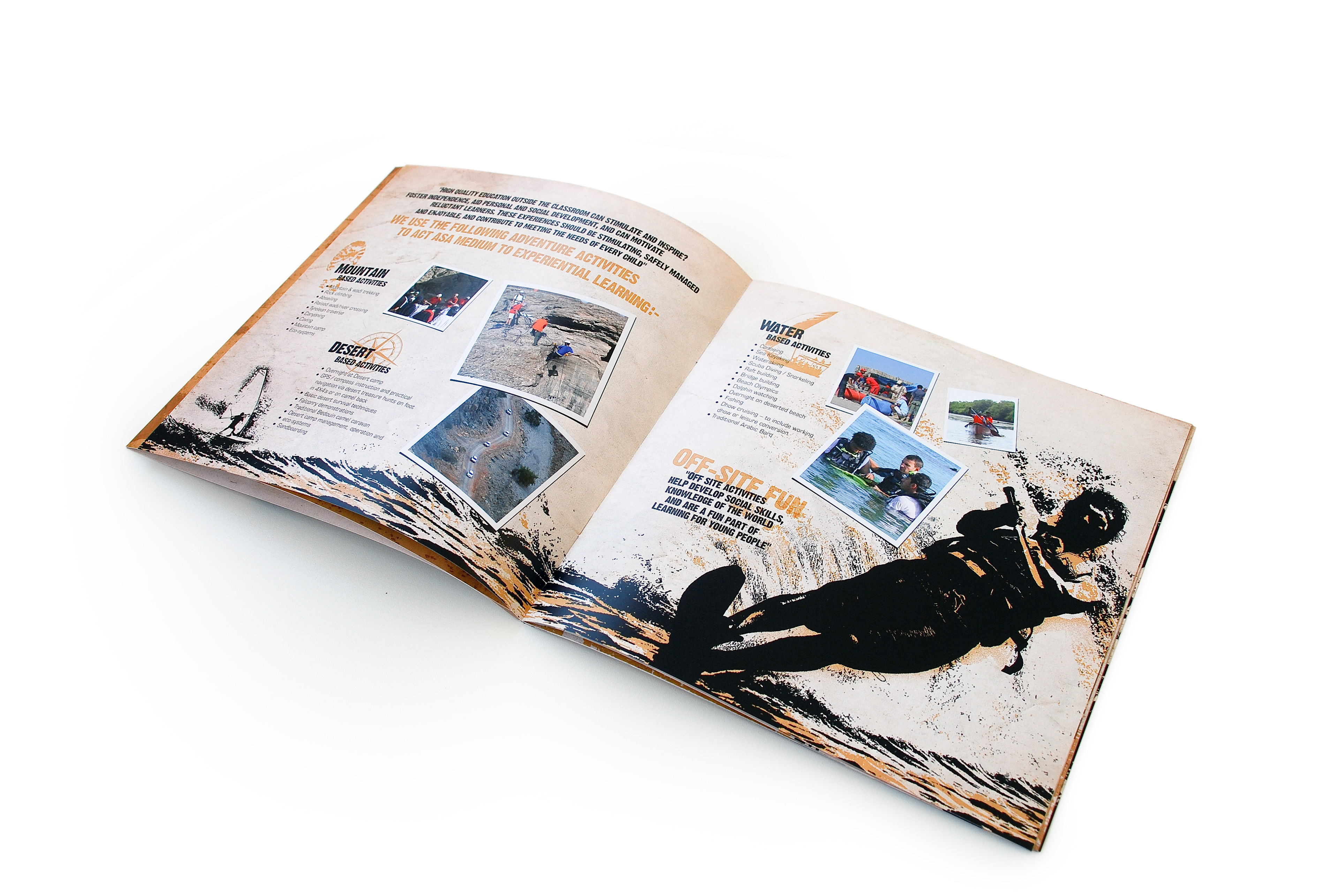 This brochure was designed for Desert Rangers, a licensed adventure education company specializing in experiential learning through outdoor activities. The concept merges rugged exploration visuals with educational storytelling, reflecting the program’s focus on teamwork, leadership, and environmental responsibility. The layout balances hand-drawn route illustrations with dramatic photography to capture the spirit of discovery and the organization’s mission to teach “through adventure.”