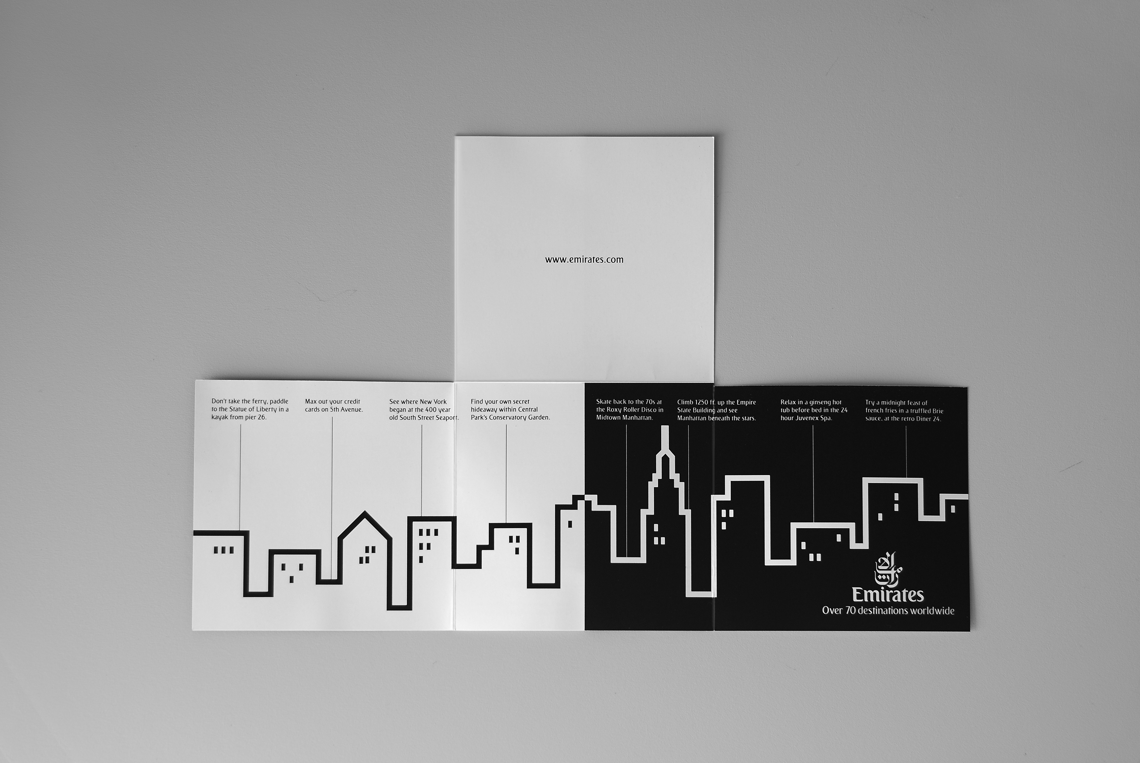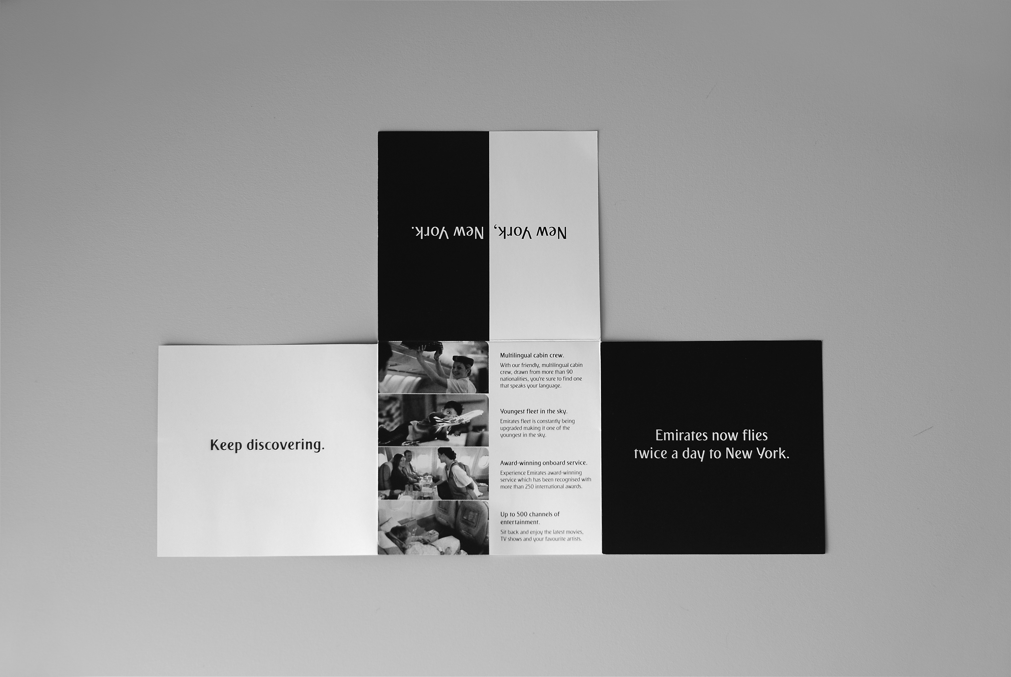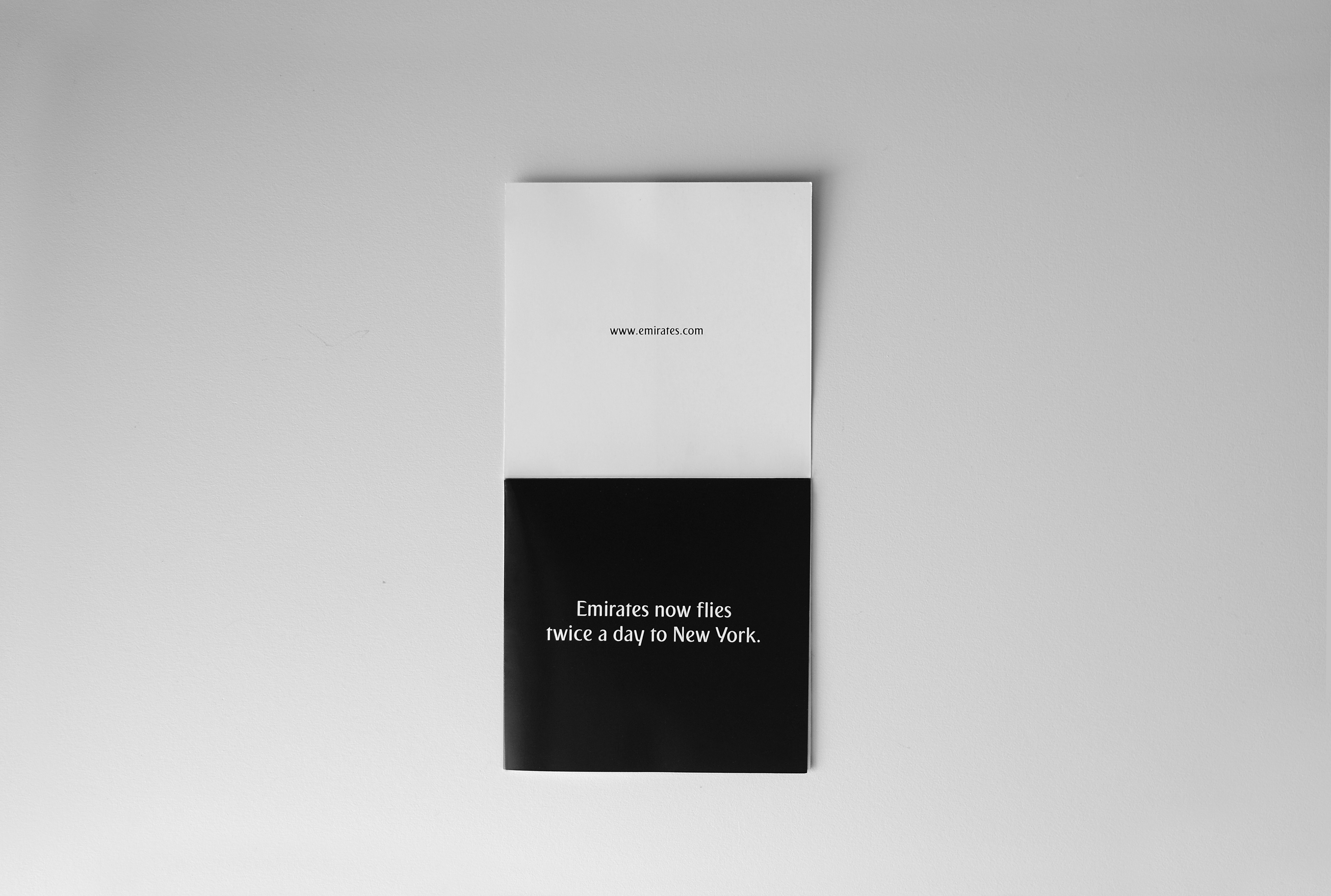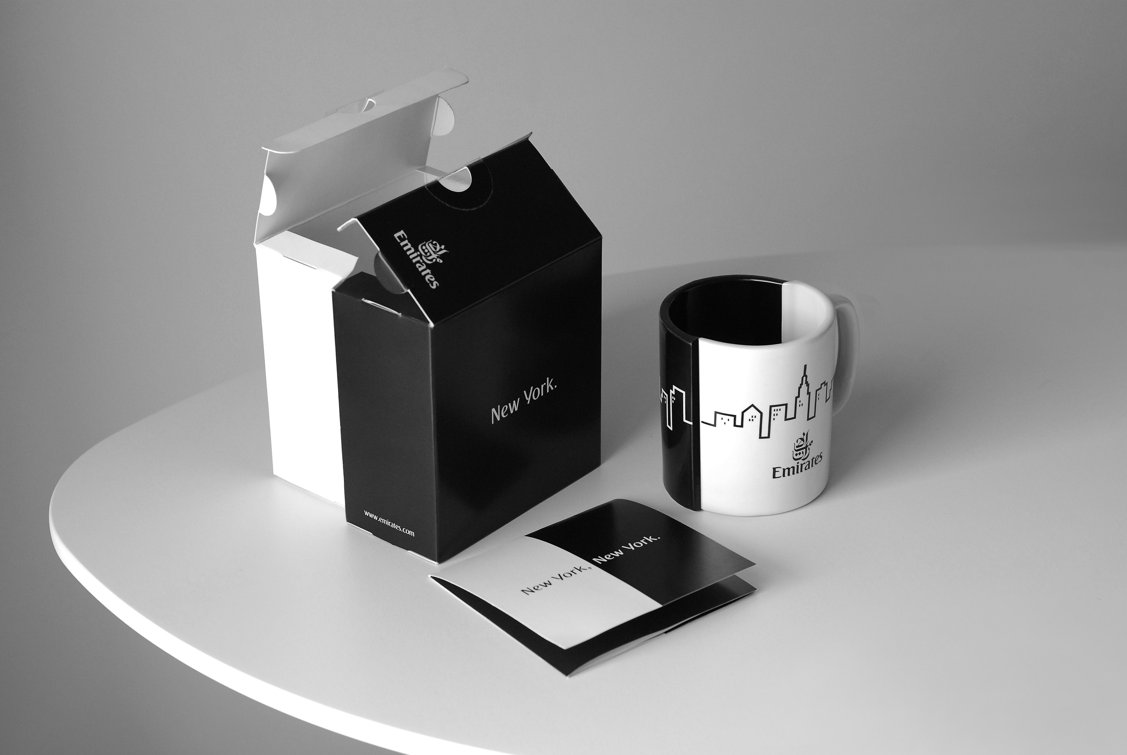 To mark the launch of Emirates Airline's second daily flight from Dubai to New York, I designed a unique inaugural gift that visually and functionally embodied "twice a day." The gift, a black-and-white mug, features a split New York skyline, creatively representing the dual flights—day and night service. The packaging reinforces this theme with a bold half-and-half design, while an accompanying card unfolds into a stylized skyline, highlighting key city landmarks and Emirates' expanded service. Given to passengers on the first flight, this exclusive keepsake elegantly conveyed the airline's commitment to greater frequency, flexibility, and enhanced connectivity between the two iconic cities.